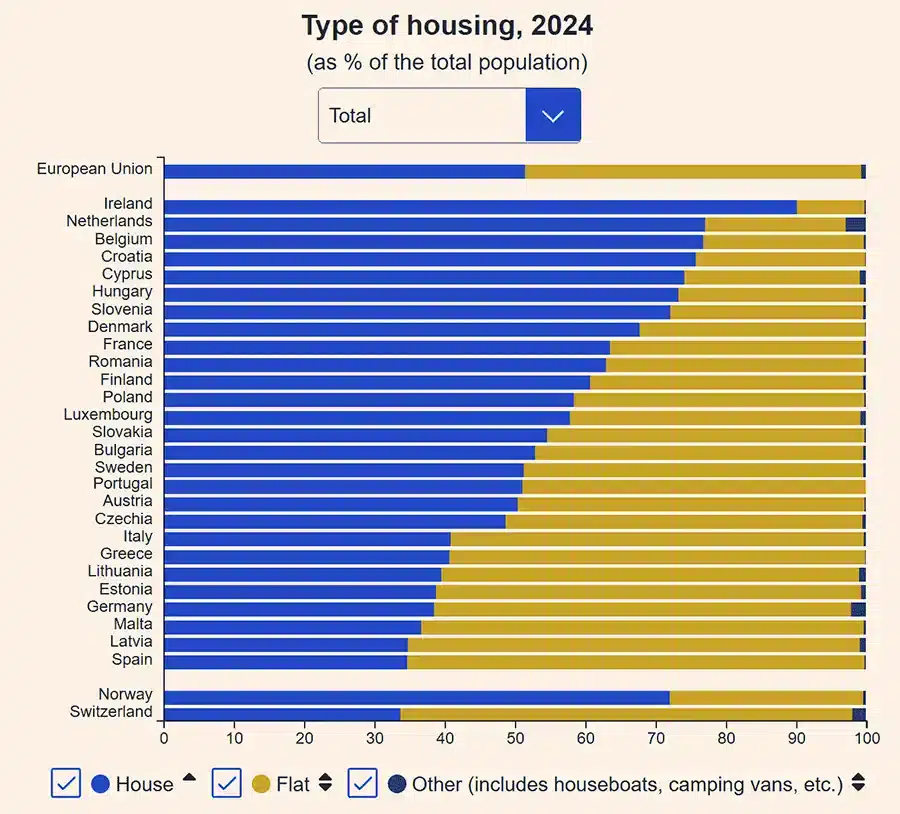 Across the EU, 51% of the population lives in houses and 48% in apartments, with the remaining 1% in alternative accommodation such as houseboats or caravans.