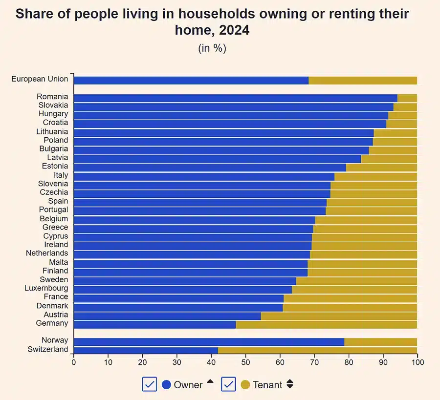 Across the EU, homeownership remains the dominant housing model in every Member State except Germany, where renting is more prevalent. In Germany, 53% of households rent their homes, followed by Austria (46%) and Denmark (39%). Overall, 32% of EU households rent, while 68% own their homes.